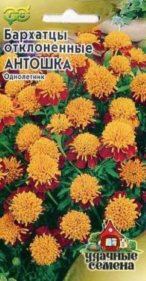 Бархатцы отклоненные Антошка Тагетес 0,3г (Россия) - бархатцы широко распространены в декоративном озеленении. Растение прямостоячее, сильноветвистое от основания, формирует цветущий куст высотой 25 см. Листья «ажурные», перисторассеченные. Соцветия до 6 см в диаметре. Цветение продолжительное в течение всего лета. Бархатцы светолюбивы и теплолюбивы, засухоустойчивы. К почвам нетребовательны, но предпочитают плодородные легкие почвы. Выращивают, как правило, рассадным способом. Используют для посадки на клумбах, рабатках, бордюрах, в балконные ящики, можно использовать как горшечную культуру.