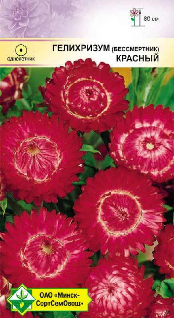 Гелихризум прицветковый Красный 0.2г (Германия) - однолетнее растение высотой до 80 см. Один из самых популярных среди сухоцветов. Соцветия-корзинки ярко-красного цвета, крупноцветковые (в диаметре 5-7 см), послужат украшением любой зимней композиции и букета. Срезают растения с полураспустившимися соцветиями и сушат в подвешенном состоянии в тени. Выращивают посевом семян непосредственно в грунт в конце апреля - начале мая или на рассаду в начале апреля.