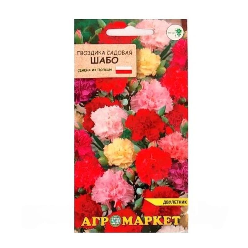 Гвоздика садовая Шабо 0,2 г (Польша) - цветки крупные, диаметром 4-6 см, махровые, душистые. Многолетнее растение, выращиваемое как однолетнее. Кустики обратнопирамидальные, компактные с четко выраженным главным стеблем, высотой 30-55 см. Листья с серым или голубым налётом. Края лепестков зазубренные. Цветет с июля по октябрь. Используют в цветниках и для срезки.