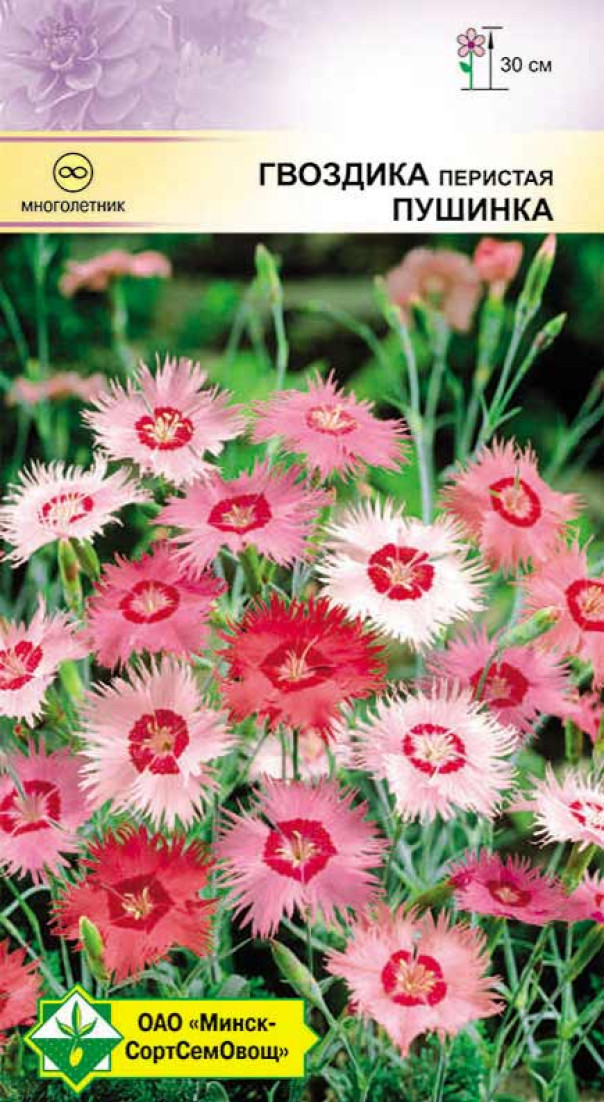 Гвоздика перистая Пушинка см 0.2г (Германия) - многолетнее растение высотой около 30 см. Цветки очень душистые, диаметром 2,5-3 см, полумахровые, розовые, малиновые, красные, часто двухцветные, с бахромчато-разрезными по краю лепестками. Широко используют для бордюров, альпинариев, рокариев, групповых посадок на газонах, каменистых садиков. Семена высевают в мае. На постоянное место высаживают в июле. Светолюбива, предпочитает хорошо дренированную плодородную почву. Зимует без укрытия.