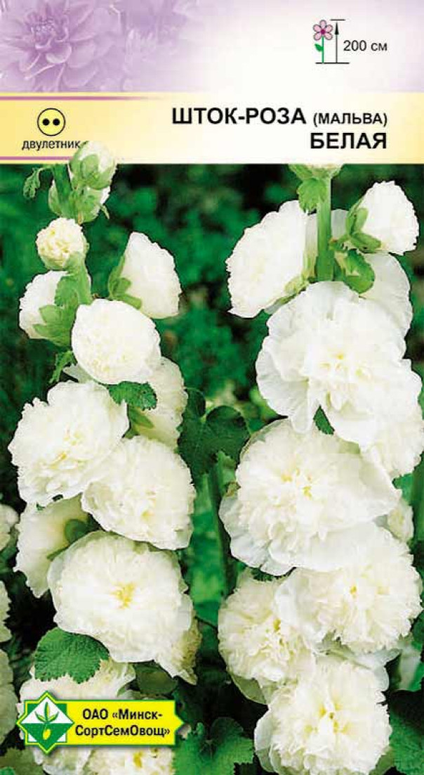 Шток-роза Белая Мальва 0.2г (Германия) - двулетнее растение высотой до 2 м. Цветки белой окраски, махровые, в диаметре 10-12 см, собраны в изящные колосовидные соцветия. Для декорирования оград и зданий, прекрасно смотрится на заднем плане цветника. В букете сохраняется до 10 дней. Семена высевают в конце мая - начале июня. На постоянное место пересаживают с комом земли в конце августа. Хорошо зимует при легком укрытии. Засухоустойчива.