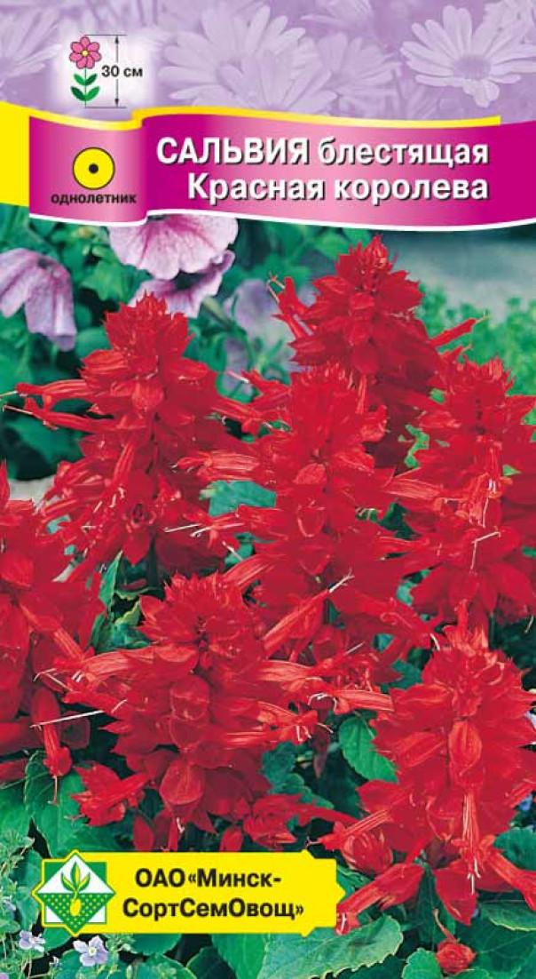 Сальвия блестящая Красная королева 0.1г (Германия) - однолетнее растение высотой 25-30 см. Огненно-красные соцветия-кисти словно парят над ярко-зеленой ажурной листвой, придавая неповторимое очарование клумбам, рабаткам, делают сальвию незаменимой участницей парада цветов в саду. Цветет обильно и продолжительно. Семена на рассаду высевают в марте. В открытый грунт рассаду высаживают, когда минует угроза заморозков. Светолюбива, но выносит и легкую полутень.