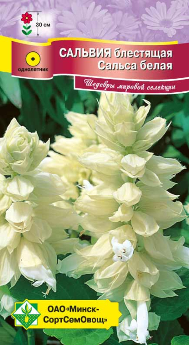 Сальвия блестящая Сальса белая 10шт (Чехия) - однолетнее растение высотой около 30 см. Белые соцветия-кисти словно парят над темно-зеленой ажурной листвой, придавая неповторимое очарование клумбам, рабаткам, делают сальвию незаменимой участницей парада цветов в саду. Цветет очень обильно, ярко и продолжительно. Семена на рассаду высевают в марте. В открытый грунт рассаду высаживают с конца мая. Светолюбима, но выносит и легкую полутень.