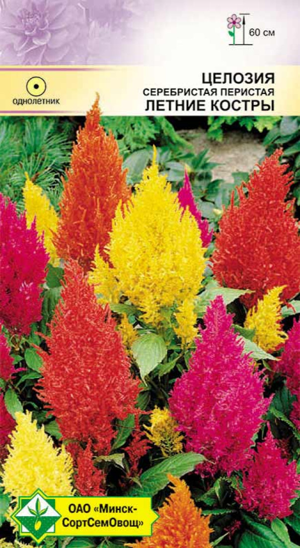 Целозия перистая Летние костры см 0.2г (Польша) - смесь окрасок. Однолетнее растение высотой около 60 см, тепло- и светолюбивое. Образует правильный пирамидальный куст с крупными метельчатыми соцветиями желтой, розовой и красной окраски. Широко используют как горшочную культуру, для оформления клумб. Семена на рассаду высевают с конца марта. В открытый грунт рассаду высаживают, когда минует угроза заморозков, на солнечное, защищенное от ветра место.