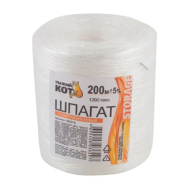 Шпагат полипропиленовый бобина 1200тэкс длина 200м Рыжий кот (Китай) - используется для подвязки сельскохозяйственных культур, для упаковки различных товаров, мелких и среднегабаритных грузов, для упаковки печатной продукции и т.д. Отличается высокой прочностью, устойчив к гниению и воздействию влаги.