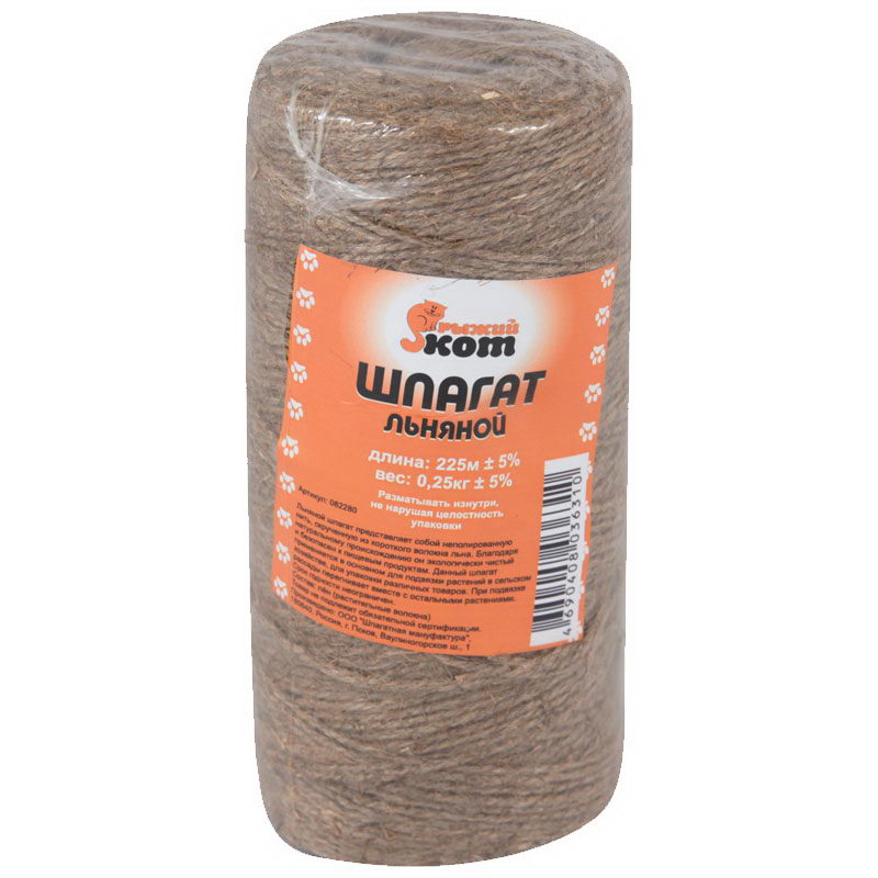 Шпагат льняной растительный D1,4мм длина 225м (Россия) - применяют в сельском хозяйстве, пищевой промышленности, торговле и почтовых учреждениях для увязки при упаковке киповых товаров и для вспомогательных операций, для копчения рыбы, сыров и колбасных изделий, а также для декоративных и дизайнерских целей.