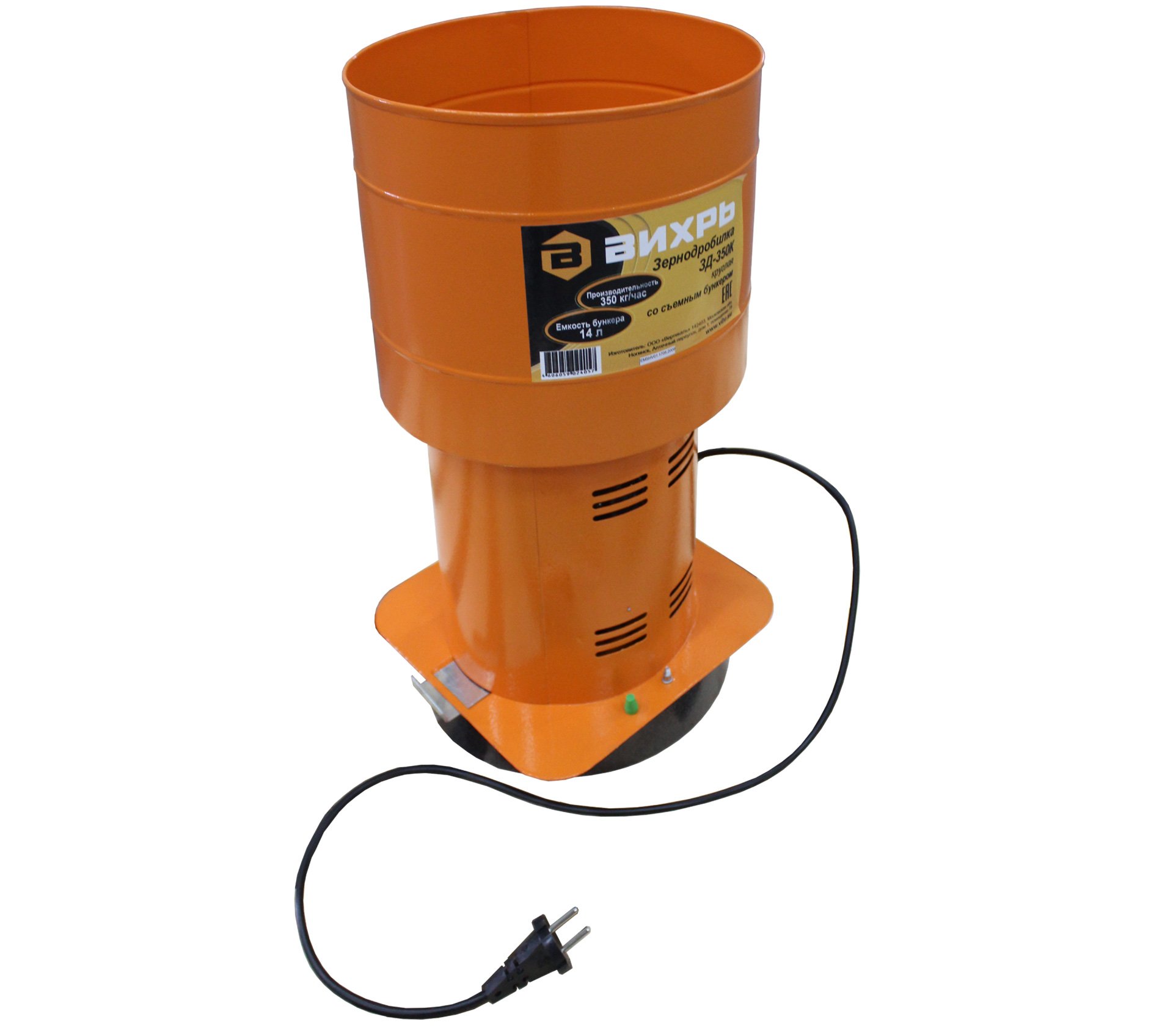 Зернодробилка ЗД-350К Вихрь (Россия) оснащена электродвигателем мощностью 1350 Вт, работающим от бытовой электросети 220В, и круглым бункером увеличенного объёма – 14 л. Частота вращения ножа – 1200 об/мин.