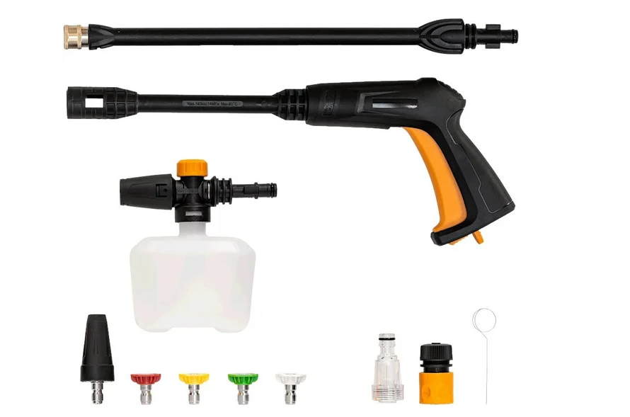 - набор аксессуаров для комфортного использования (держатель пистолета, держатель шнура питания, держатель форсунок, фильтр подачи воды, игла для очистки форсунки, винты)
