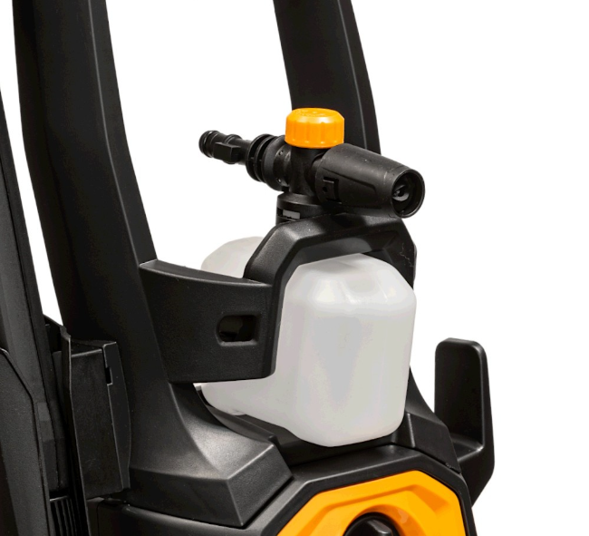 - Усиленный пеногенератор из износостойкого пластика позволяет точно настраивать интенсивность пены и получать густую пенную смесь для различных задач очистки.