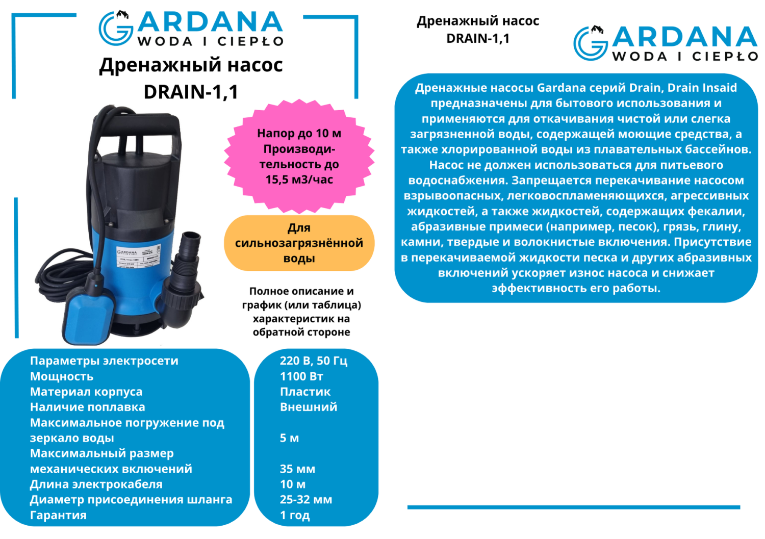 Дренажный насос DRAIN-1,1 GARDANA (Китай) - предназначен для бытового использования и применяется для откачивания чистой или сильно загрязненной воды, содержащей моющие средства, а также хлорированной воды из плавательных бассейнов с максимальным размером примесей и включений не более 35 мм. Насос не должен использоваться для питьевого водоснабжения. Запрещается перекачивание насосом взрывоопасных, легковоспламеняющихся, агрессивных жидкостей, а также жидкостей, содержащих фекалии, абразивные примеси (например, песок), грязь, глину, камни, твердые и волокнистые включения. Присутствие в перекачиваемой жидкости песка и других абразивных включений ускоряет износ насоса и снижает эффективность его работы.