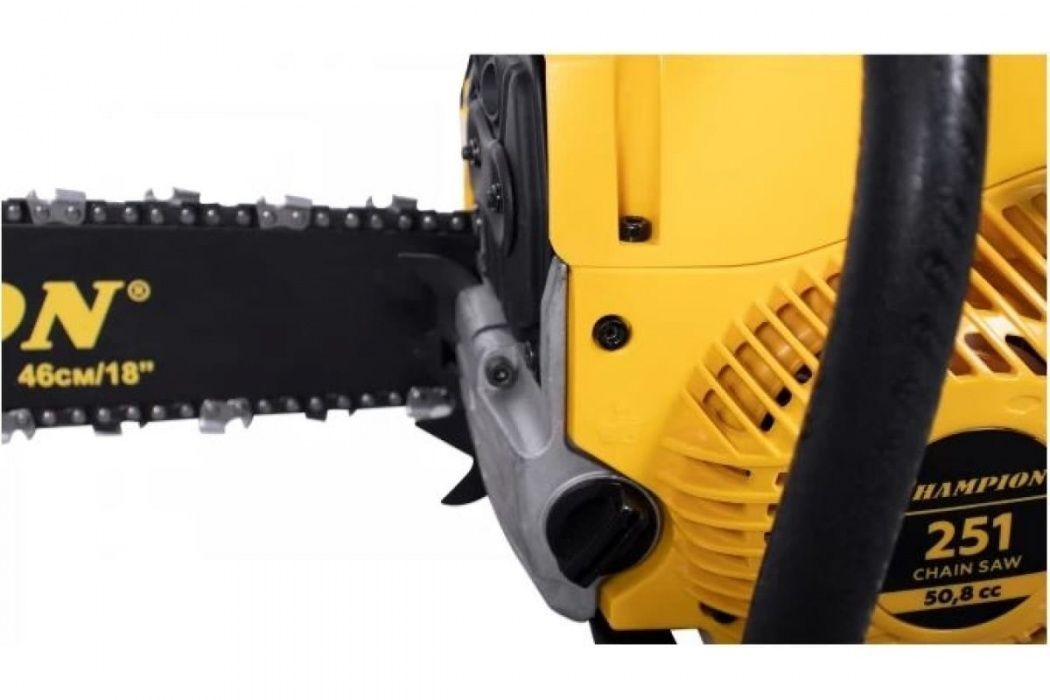 У цепи пилы профессиональный шаг 0,325 дюйма под широкий паз 1,5 мм. Бензопила Champion 251-18 оборудована подогревом карбюратора, позволяющим эксплуатацию при отрицательных температурах. В основании пильной шины есть стальной зубчатый упор, упрощающий распиловку бревен больших диаметров. Подача смазывающего масла на шину и цепь производиться автоматически посредством металлического насоса. Двигатель бензопилы работает на смеси двухтактного масла с бензином в пропорции 1 к 50.