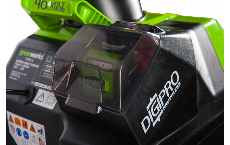 - Этот снегоочиститель оснащён надежным бесщеточным двигателем DigiPro, который сопоставим по мощности с бензиновыми аналогами, при этом полностью экологичен, имеет высокий крутящий момент, низкий уровень шума и вибраций, а так же легок в использование, а именно не требует подготовки масло-бензиновой смеси и какого-либо обслуживания.