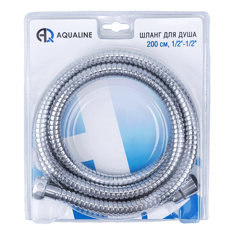 Шланг для душа конус имп 1/2" + имп 1/2" длина 2м в блистере AQUALINE (Россия) изготовлен из нержавеющей стали, имеет хромированное покрытие и конусную концевую арматуру, препятствующую проворачиванию шланга в держателе. Торцевые втулки изготовлены из высококачественной латуни, покрытые хромом. Способ соединения - гайка-конус.