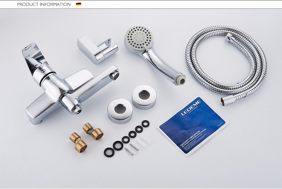 - В комплекте: держатель, эксцентрики, прокладки, декоративные чашки, смеситель, душевой шланг (150 см), душевая лейка