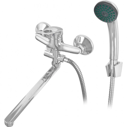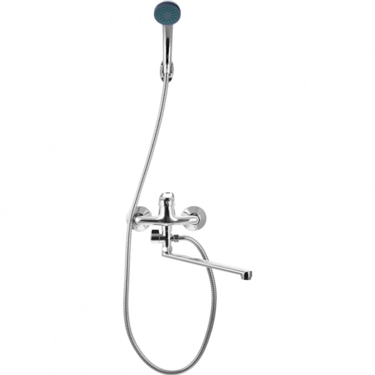 Смеситель для ванны Wisent WP21213 - универсальная однорычажная модель с длинным поворотным изливом, изготовленная из цинкового сплава. Смеситель предназначен для вертикальной установки. Однорежимная душевая лейка с держателем и шлангом длиной 1.5 метра в комплекте.
