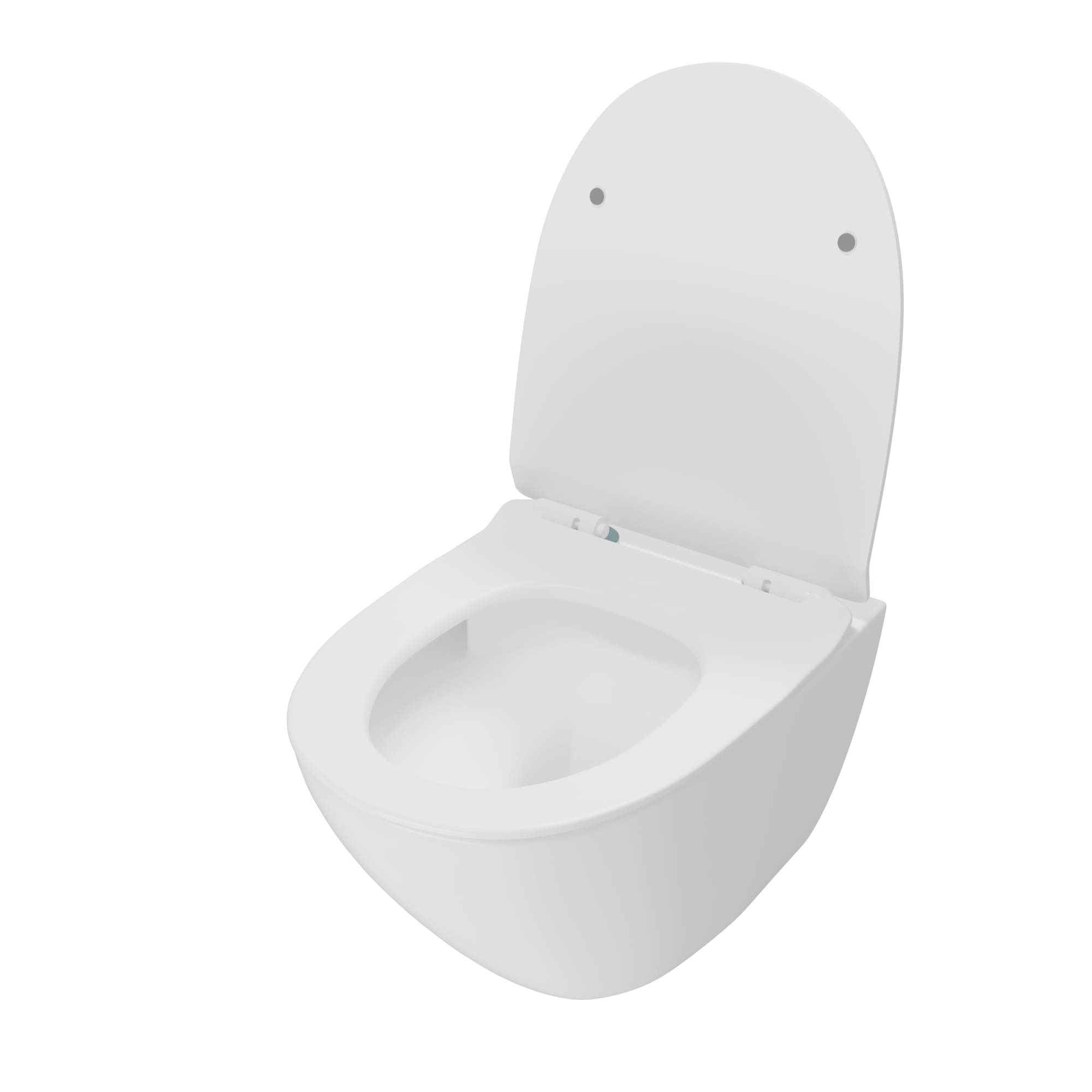 - Подвесной унитаз выполненный из фарфора, безободковый, в комплекте с плавноопускающимся сиденьем.