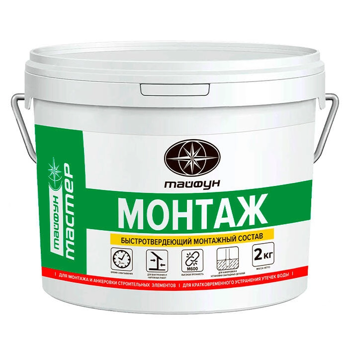 Быстросхватывающаяся монтажная цементная смесь Тайфун Мастер Монтаж (Беларусь) предназначен для крепления стальных, железобетонных, полимерных строительных элементов на горизонтальных и вертикальных поверхностях: фундаментных шурупов, столбиков ограждения, балконных и лестничных перил, анкеров, крючков, дюбелей, строп, петель для окон и дверей, элементов электрооборудования. Состав может использоваться для монтажа подоконников, порогов, лестничных ступеней, ремонта бетонных элементов и заполнения трещин в плитах перекрытий, полах, цементных штукатурках, сборных элементах внутри и снаружи зданий.