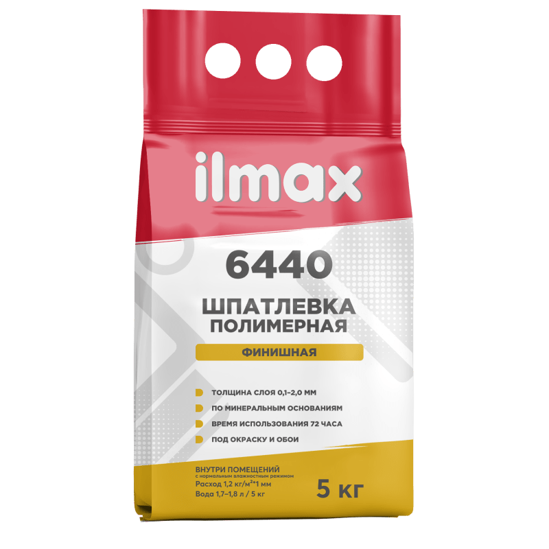 ilmax 6440 предназначена для финишного выравнивания шероховатостей, неровностей, заделки стыков гипсокартонных листов с использованием армирующей ленты, заполнения царапин, трещин, выбоин и других дефектов с целью получения идеально ровной и гладкой поверхности стен и потолков. Используется по минеральным поверхностям из бетона; цементных, цементно-известковых и гипсовых штукатурок; гипсокартонных и гипсоволокнистых листов; гипсовых плит. Рекомендуется для внутренних работ в сухих и влажных помещениях с их последующей отделкой (окраска, оклейка обоями). Можно наносить в несколько слоев.